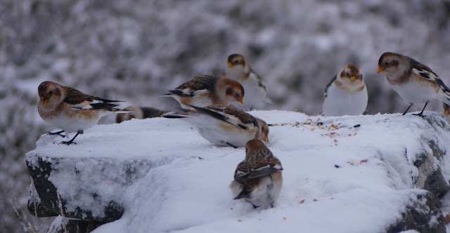Snow Buntings at the ski station carpark at Aviemore....looking it up the collective noun is apparently a drift of snow finches...personal I think it should be a flurry, or maybe a drift when they are on the ground and a flurry when landing or taking off in a large group.